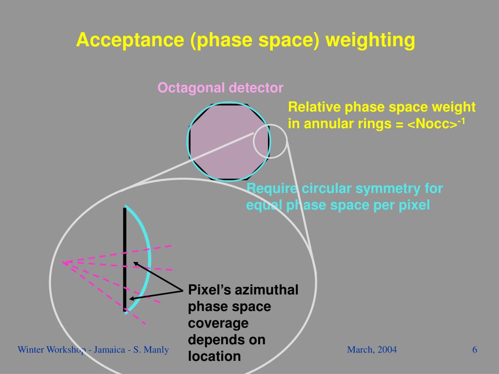 Octagonal detector Require circular symmetry for equal phase space per pixel Pixel’sazimuthalphase space coverage depends on location Acceptance (phase space) weighting Relative phase space weight in annular rings = <Nocc>-1 Winter Workshop - Jamaica - S. Manly