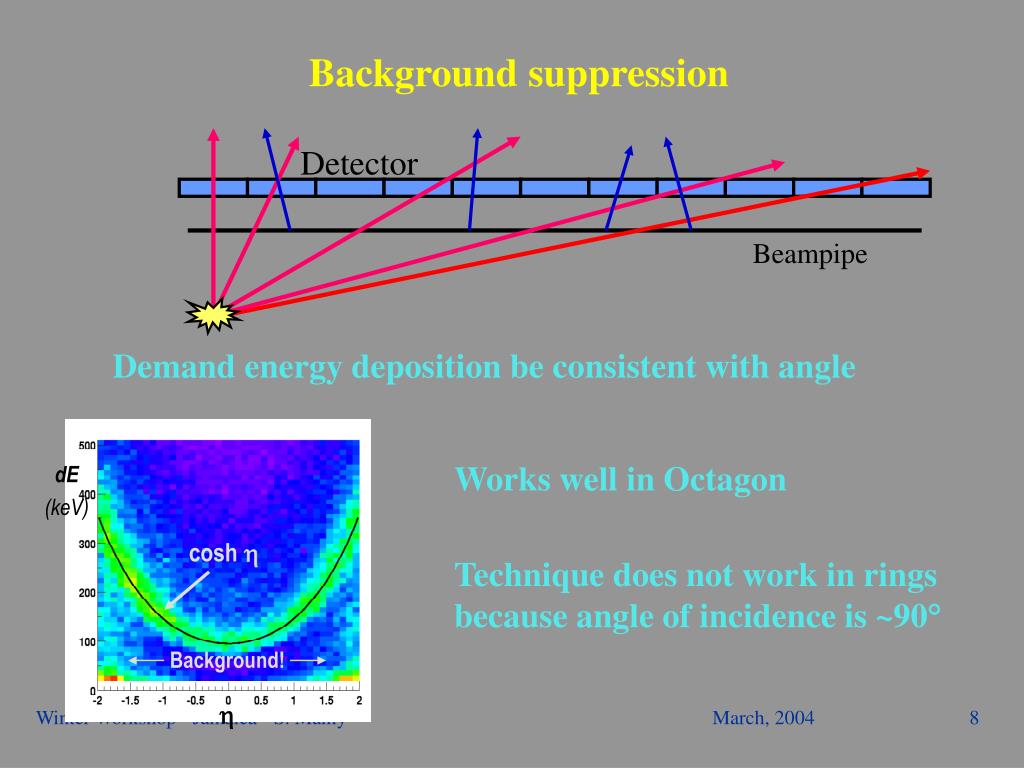 Detector Beampipe dE (keV) cosh h Background! h Background suppression Demand energy deposition be consistent with angle Works well in Octagon Technique does not work in rings because angle of incidence is ~90 Winter Workshop - Jamaica - S. Manly