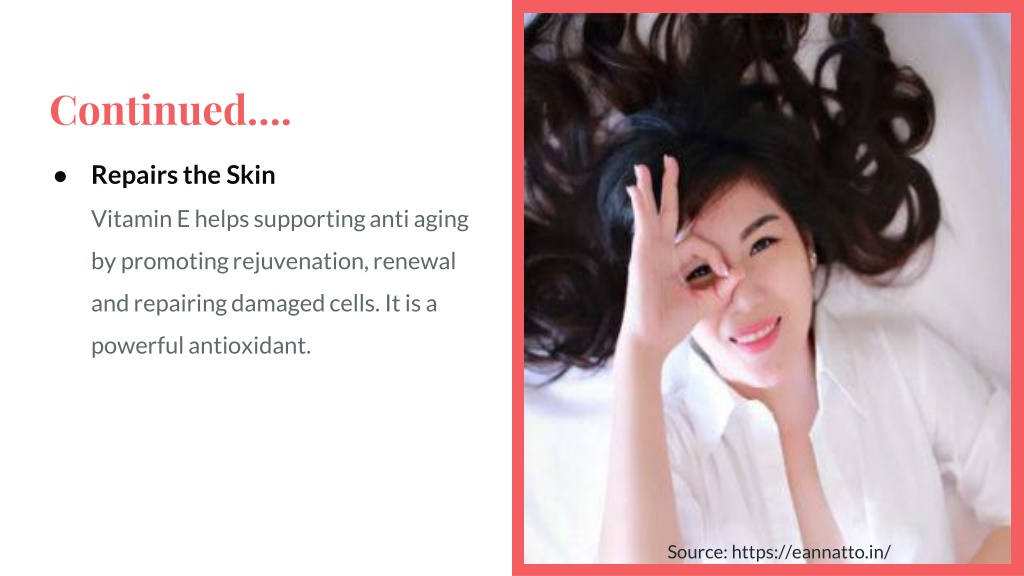 Continued…. ● Repairs the Skin Vitamin E helps supporting anti aging by promoting rejuvenation, renewal and repairing damaged cells. It is a powerful antioxidant. Source: https://eannatto.in/