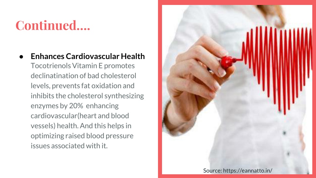 Continued…. ● Enhances Cardiovascular Health Tocotrienols Vitamin E promotes declinatination of bad cholesterol levels, prevents fat oxidation and inhibits the cholesterol synthesizing enzymes by 20% enhancing cardiovascular(heart and blood vessels) health. And this helps in optimizing raised blood pressure issues associated with it. Source: https://eannatto.in/