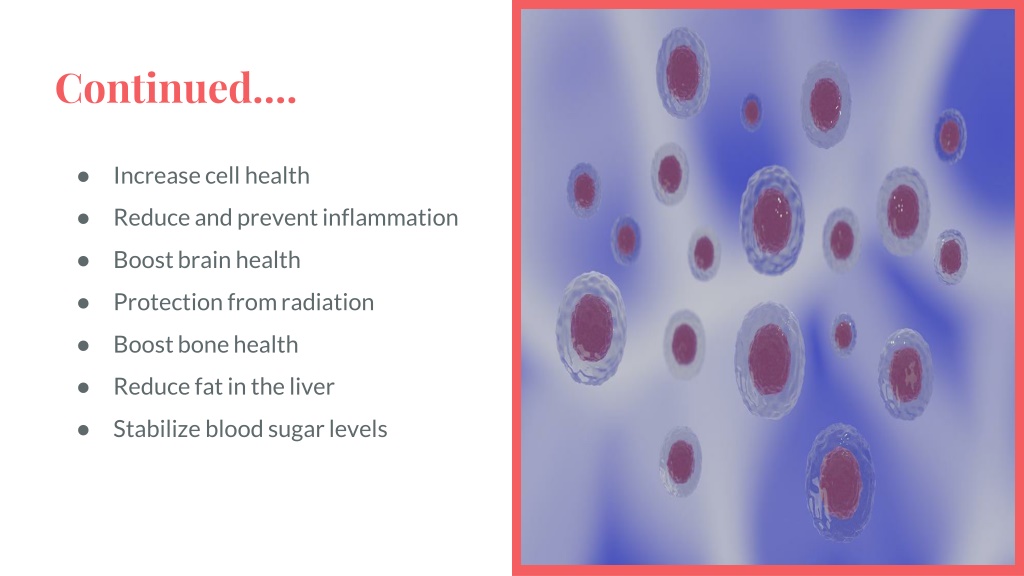 Continued…. Increase cell health ● Reduce and prevent inflammation ● Boost brain health ● Protection from radiation ● Boost bone health ● Reduce fat in the liver ● Stabilize blood sugar levels ●