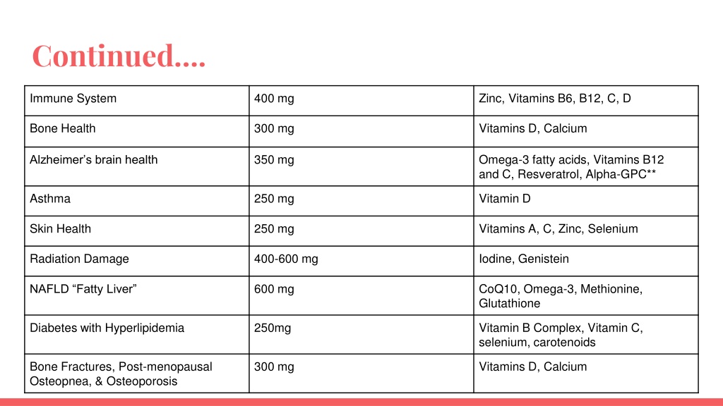Continued…. Immune System 400 mg Zinc, Vitamins B6, B12, C, D Bone Health 300 mg Vitamins D, Calcium 350 mg Omega-3 fatty acids, Vitamins B12 and C, Resveratrol, Alpha-GPC** Alzheimer’s brain health Asthma 250 mg Vitamin D Skin Health 250 mg Vitamins A, C, Zinc, Selenium Radiation Damage 400-600 mg Iodine, Genistein 600 mg CoQ10, Omega-3, Methionine, Glutathione NAFLD “Fatty Liver” Diabetes with Hyperlipidemia 250mg Vitamin B Complex, Vitamin C, selenium, carotenoids Bone Fractures, Post-menopausal Osteopnea, & Osteoporosis 300 mg Vitamins D, Calcium