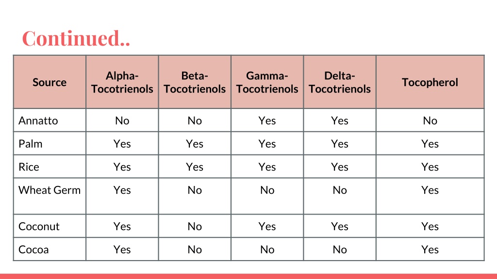 Continued.. Alpha- Tocotrienols Beta- Gamma- Tocotrienols Delta- Source Tocopherol Tocotrienols Tocotrienols Annatto No No Yes Yes No Palm Yes Yes Yes Yes Yes Rice Yes Yes Yes Yes Yes Wheat Germ Yes No No No Yes Coconut Yes No Yes Yes Yes Cocoa Yes No No No Yes