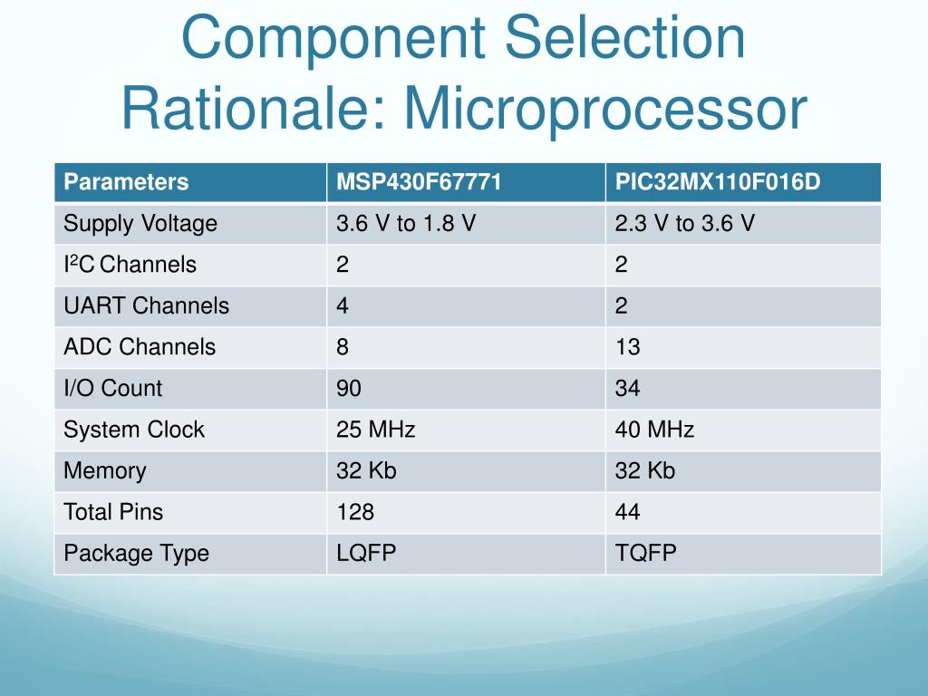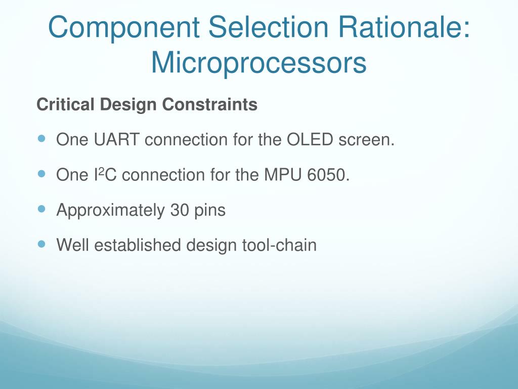 Component Selection Rationale: Microprocessors Critical Design Constraints • One UART connection for the OLED screen. • One I2C connection for the MPU 6050. • Approximately 30 pins • Well established design tool-chain