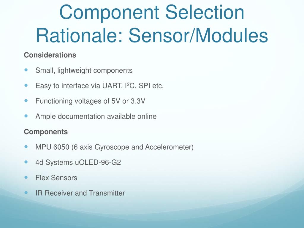 Component Selection Rationale: Sensor/Modules Considerations • Small, lightweightcomponents • Easy to interface via UART, I2C, SPI etc. • Functioning voltages of 5V or 3.3V • Ample documentation available online Components • MPU 6050 (6 axis Gyroscope and Accelerometer) • 4d Systems uOLED-96-G2 • Flex Sensors • IR Receiver and Transmitter