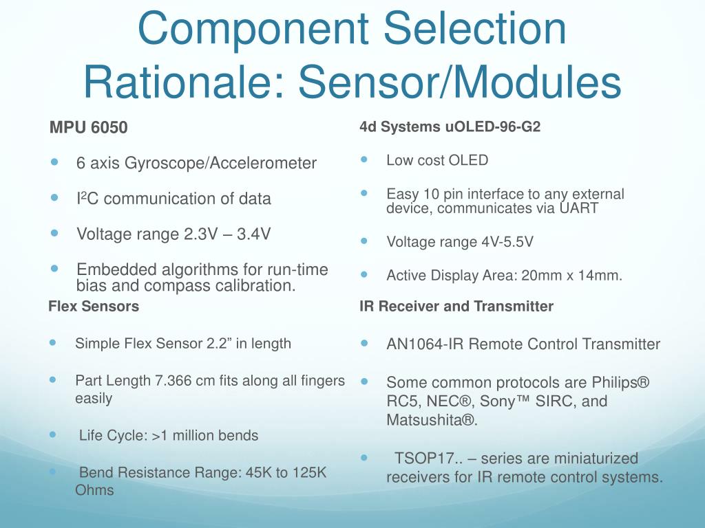 Component Selection Rationale: Sensor/Modules 4d Systems uOLED-96-G2 • Low cost OLED • Easy 10 pin interface to any external device, communicates via UART • Voltage range 4V-5.5V • Active Display Area: 20mm x 14mm. MPU 6050 • 6 axis Gyroscope/Accelerometer • I2C communication of data • Voltage range 2.3V – 3.4V • Embedded algorithms for run-time bias and compass calibration. IR Receiver and Transmitter • AN1064-IR Remote Control Transmitter • Some common protocols are Philips® RC5, NEC®, Sony™ SIRC, and Matsushita®. • TSOP17.. – series are miniaturized receivers for IR remote control systems. Flex Sensors • Simple Flex Sensor 2.2” in length • Part Length 7.366 cm fits along all fingers easily • Life Cycle: >1 million bends • Bend Resistance Range: 45K to 125K Ohms