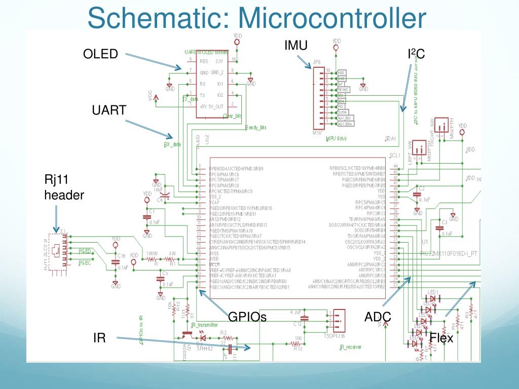 Schematic: Microcontroller IMU OLED I2C UART Rj11 header GPIOs ADC IR Flex