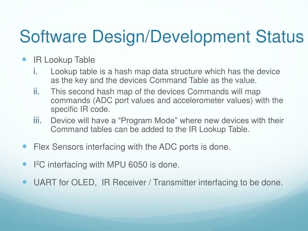 Software Design/Development Status • IR Lookup Table • Lookup table is a hash map data structure which has the device as the key and the devices Command Table as the value. • This second hash map of the devices Commands will map commands (ADC port values and accelerometer values) with the specific IR code. • Device will have a “Program Mode” where new devices with their Command tables can be added to the IR Lookup Table. • Flex Sensors interfacing with the ADC ports is done. • I2C interfacing with MPU 6050 is done. • UART for OLED, IR Receiver / Transmitter interfacing to be done.