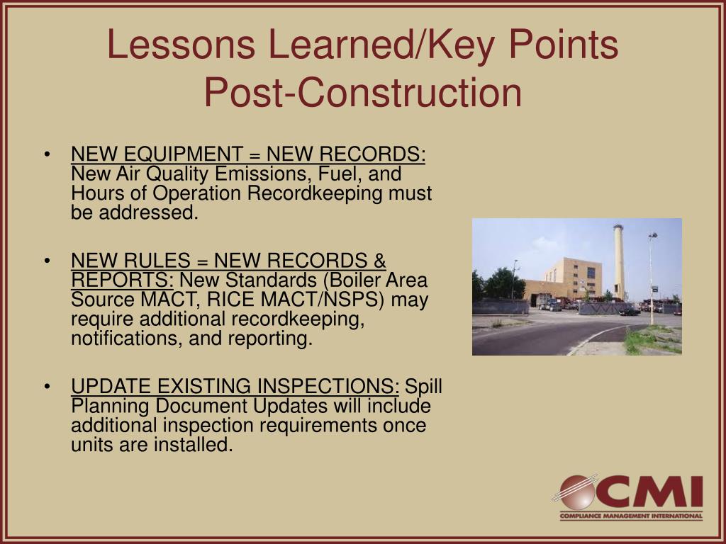 Lessons Learned/Key PointsPost-Construction • NEW EQUIPMENT = NEW RECORDS: New Air Quality Emissions, Fuel, and Hours of Operation Recordkeeping must be addressed. • NEW RULES = NEW RECORDS & REPORTS: New Standards (Boiler Area Source MACT, RICE MACT/NSPS) may require additional recordkeeping, notifications, and reporting. • UPDATE EXISTING INSPECTIONS: Spill Planning Document Updates will include additional inspection requirements once units are installed.