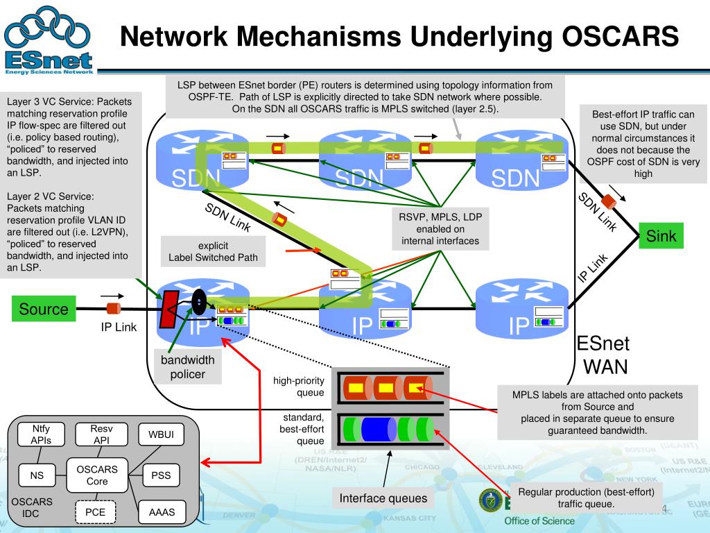 Network Mechanisms Underlying OSCARS LSP between ESnet border (PE) routers is determined using topology information from OSPF-TE. Path of LSP is explicitly directed to take SDN network where possible. On the SDN all OSCARS traffic is MPLS switched (layer 2.5). Layer 3 VC Service: Packets matching reservation profile IP flow-spec are filtered out (i.e. policy based routing), “policed” to reserved bandwidth, and injected into an LSP. Layer 2 VC Service: Packets matching reservation profile VLAN ID are filtered out (i.e. L2VPN), “policed” to reserved bandwidth, and injected into an LSP. Best-effort IP traffic can use SDN, but under normal circumstances it does not because the OSPF cost of SDN is very high SDN SDN SDN SDN Link SDN Link RSVP, MPLS, LDP enabled on internal interfaces Sink explicitLabel Switched Path IP Link Source IP IP IP IP Link ESnet WAN bandwidth policer high-priority queue MPLS labels are attached onto packets from Source and placed in separate queue to ensure guaranteed bandwidth. standard,best-effortqueue Ntfy APIs Resv API WBUI OSCARS Core NS PSS Regular production (best-effort)traffic queue. Interface queues OSCARS IDC AAAS PCE