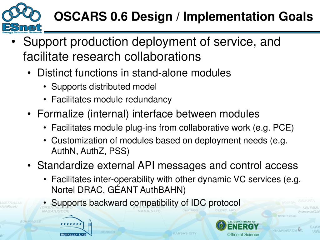 OSCARS 0.6 Design / Implementation Goals • Support production deployment of service, and facilitate research collaborations • Distinct functions in stand-alone modules • Supports distributed model • Facilitates module redundancy • Formalize (internal) interface between modules • Facilitates module plug-ins from collaborative work (e.g. PCE) • Customization of modules based on deployment needs (e.g. AuthN, AuthZ, PSS) • Standardize external API messages and control access • Facilitates inter-operability with other dynamic VC services (e.g. Nortel DRAC, GÉANT AuthBAHN) • Supports backward compatibility of IDC protocol