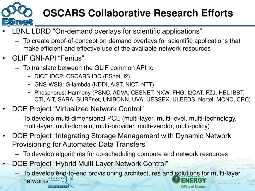 OSCARS Collaborative Research Efforts • LBNL LDRD “On-demand overlays for scientific applications” • To create proof-of-concept on-demand overlays for scientific applications that make efficient and effective use of the available network resources • GLIF GNI-API “Fenius” • To translate between the GLIF common API to • DICE IDCP: OSCARS IDC (ESnet, I2) • GNS-WSI3: G-lambda (KDDI, AIST, NICT, NTT) • Phosphorus: Harmony (PSNC, ADVA, CESNET, NXW, FHG, I2CAT, FZJ, HEL IBBT, CTI, AIT, SARA, SURFnet, UNIBONN, UVA, UESSEX, ULEEDS, Nortel, MCNC, CRC) • DOE Project “Virtualized Network Control” • To develop multi-dimensional PCE (multi-layer, multi-level, multi-technology, multi-layer, multi-domain, multi-provider, multi-vendor, multi-policy) • DOE Project “Integrating Storage Management with Dynamic Network Provisioning for Automated Data Transfers” • To develop algorithms for co-scheduling compute and network resources • DOE Project “Hybrid Multi-Layer Network Control” • To develop end-to-end provisioning architectures and solutions for multi-layer networks