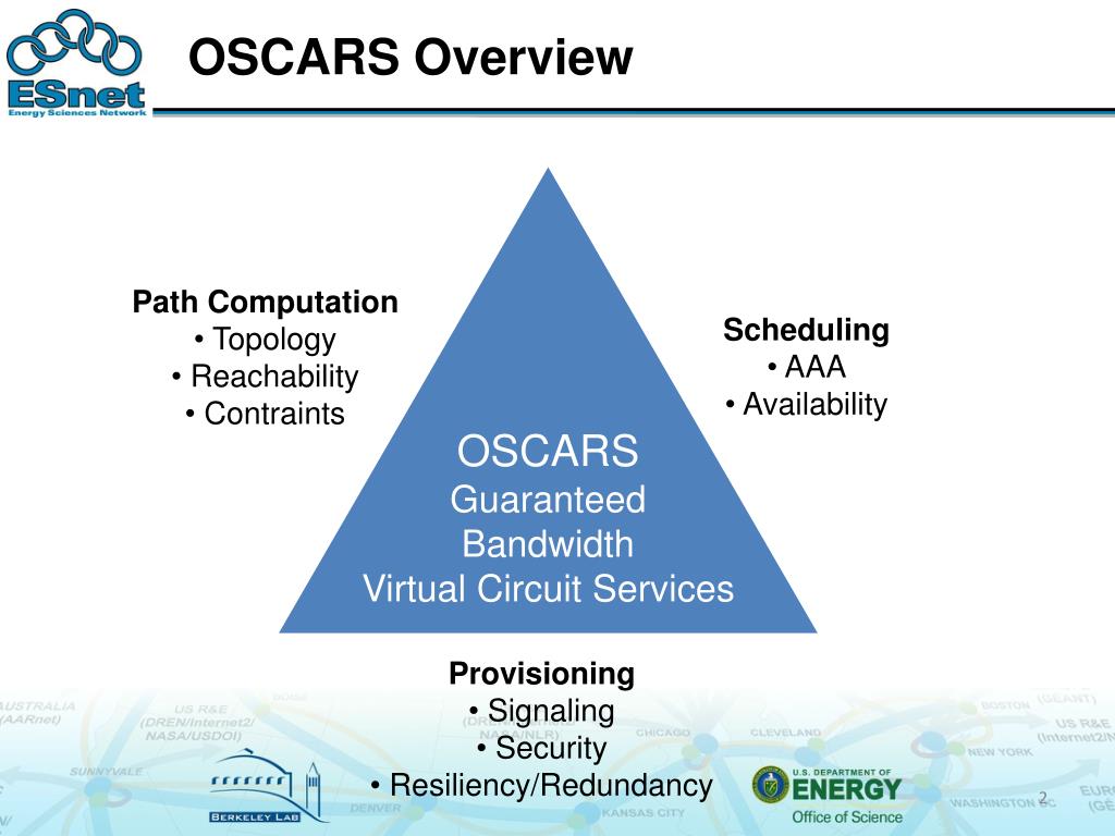 OSCARS Overview OSCARS Guaranteed Bandwidth Virtual Circuit Services • Path Computation • Topology • Reachability • Contraints • Scheduling • AAA • Availability • Provisioning • Signaling • Security • Resiliency/Redundancy