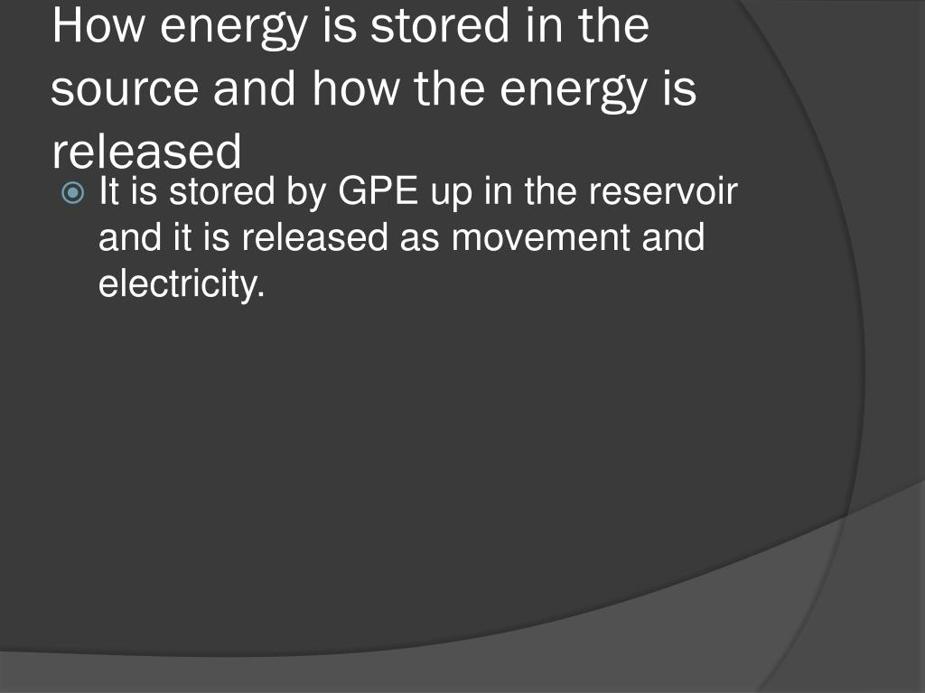 How energy is stored in the source and how the energy is released • It is stored by GPE up in the reservoir and it is released as movement and electricity.