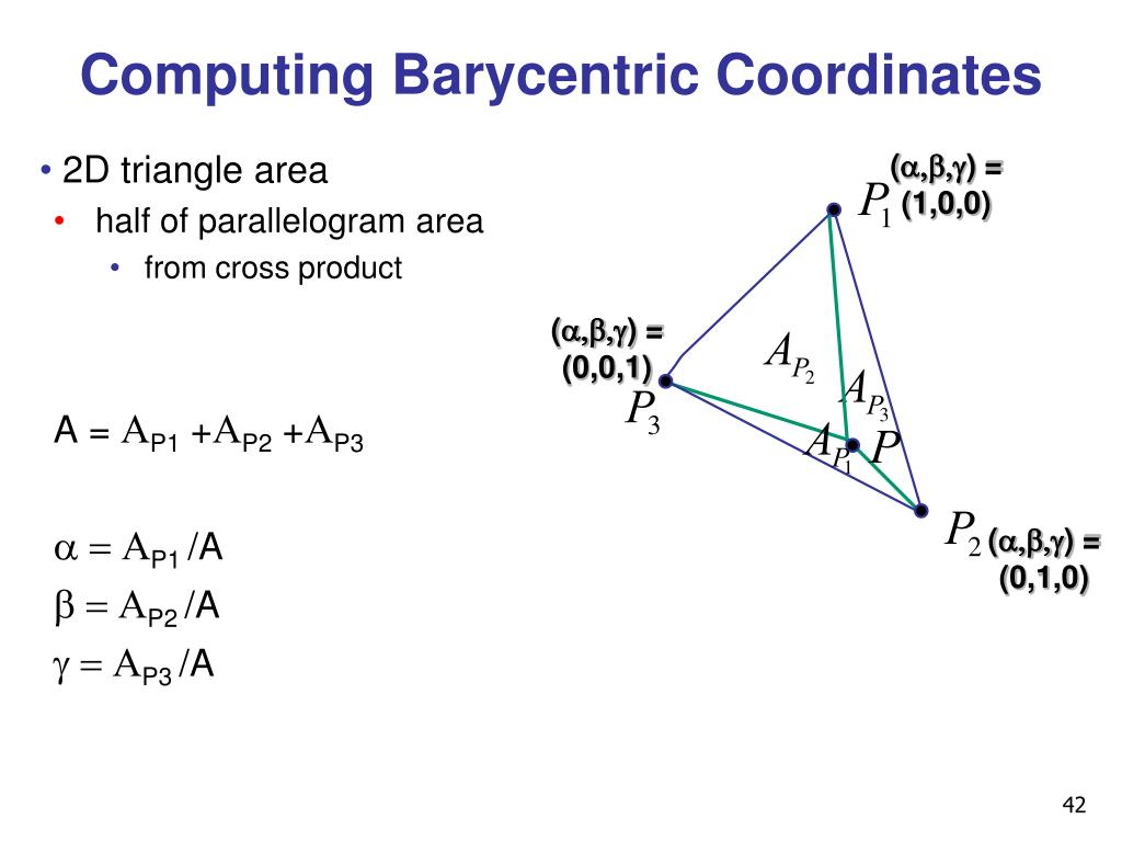 Computing Barycentric Coordinates (a,b,g) = (1,0,0) • 2D triangle area • half of parallelogram area • from cross product A = AP1 +AP2 +AP3 a = AP1 /A b = AP2 /A g = AP3 /A (a,b,g) = (0,0,1) (a,b,g) = (0,1,0)