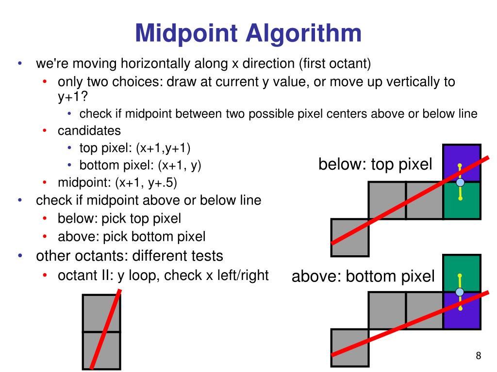 Midpoint Algorithm • we're moving horizontally along x direction (first octant) • only two choices: draw at current y value, or move up vertically to y+1? • check if midpoint between two possible pixel centers above or below line • candidates • top pixel: (x+1,y+1) • bottom pixel: (x+1, y) • midpoint: (x+1, y+.5) • check if midpoint above or below line • below: pick top pixel • above: pick bottom pixel • other octants: different tests • octant II: y loop, check x left/right below: top pixel above: bottom pixel