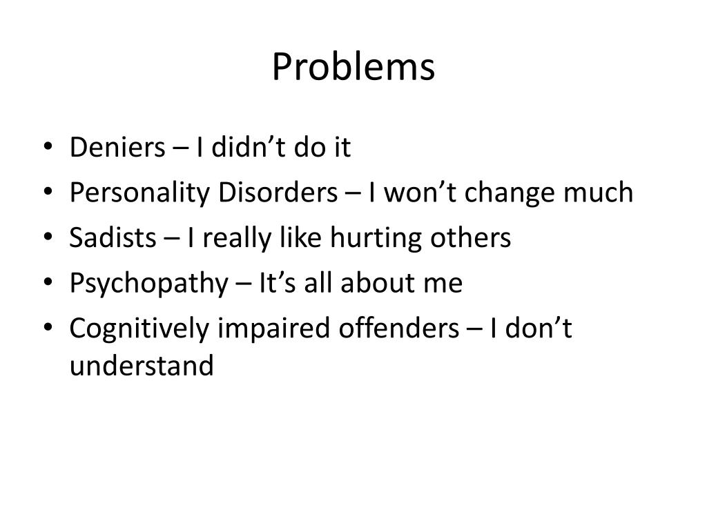 Problems • Deniers – I didn’t do it • Personality Disorders – I won’t change much • Sadists – I really like hurting others • Psychopathy – It’s all about me • Cognitively impaired offenders – I don’t understand