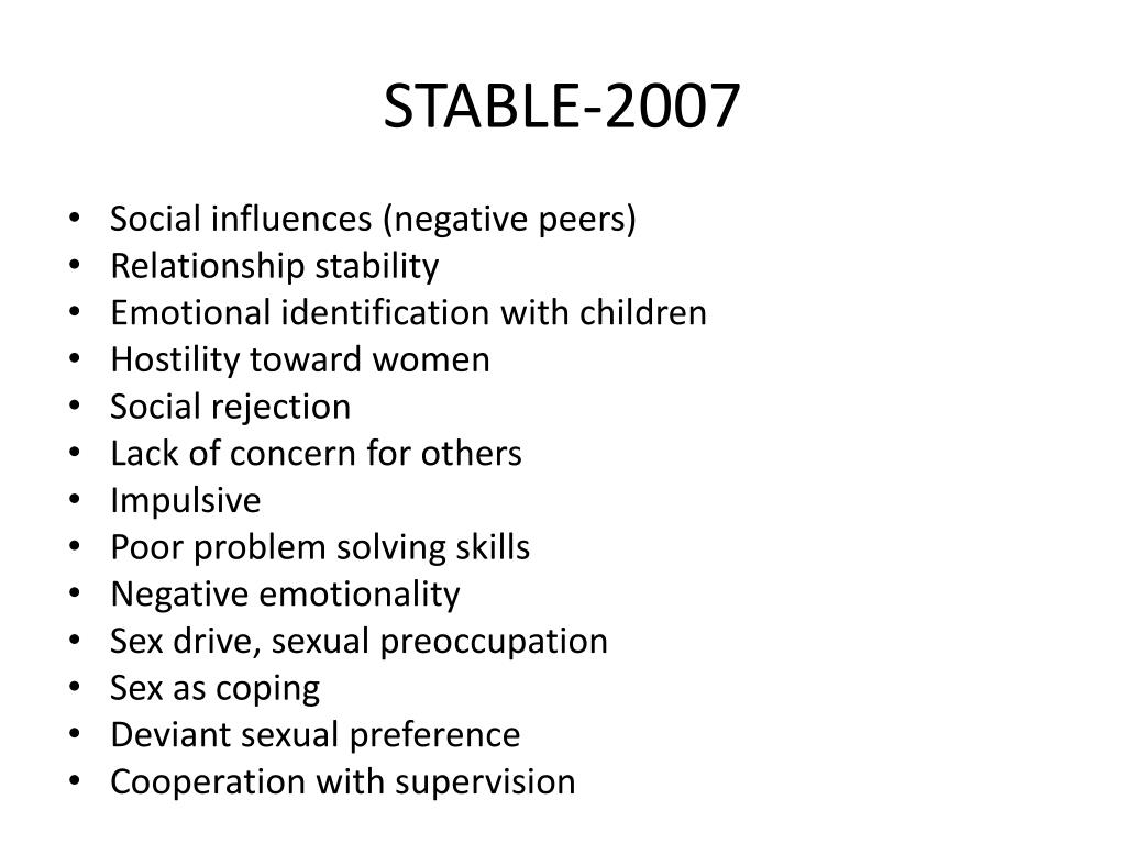 STABLE-2007 • Social influences (negative peers) • Relationship stability • Emotional identification with children • Hostility toward women • Social rejection • Lack of concern for others • Impulsive • Poor problem solving skills • Negative emotionality • Sex drive, sexual preoccupation • Sex as coping • Deviant sexual preference • Cooperation with supervision