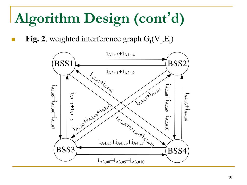 Algorithm Design Interference analysis: • Interference caused by AP v to client u (uS(v)) • Interference by AP v to all clients in a BSS Bw, • We only consider downlink case, 9