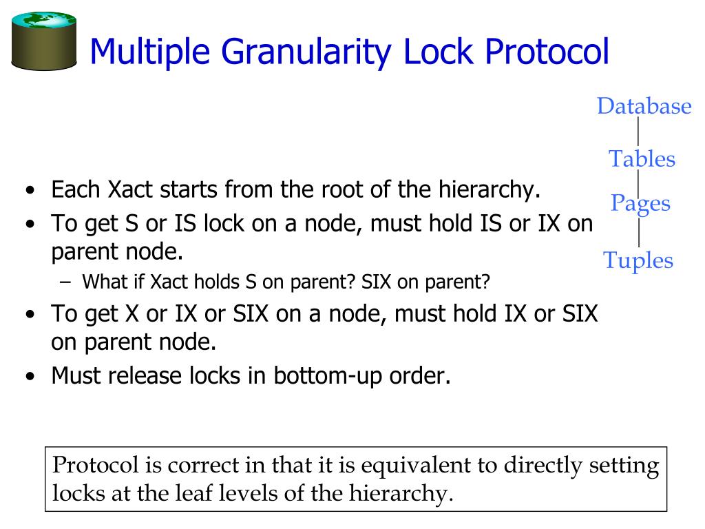 Database Tables Pages Tuples Multiple Granularity Lock Protocol • Each Xact starts from the root of the hierarchy. • To get S or IS lock on a node, must hold IS or IX on parent node. • What if Xact holds S on parent? SIX on parent? • To get X or IX or SIX on a node, must hold IX or SIX on parent node. • Must release locks in bottom-up order. Protocol is correct in that it is equivalent to directly setting locks at the leaf levels of the hierarchy.