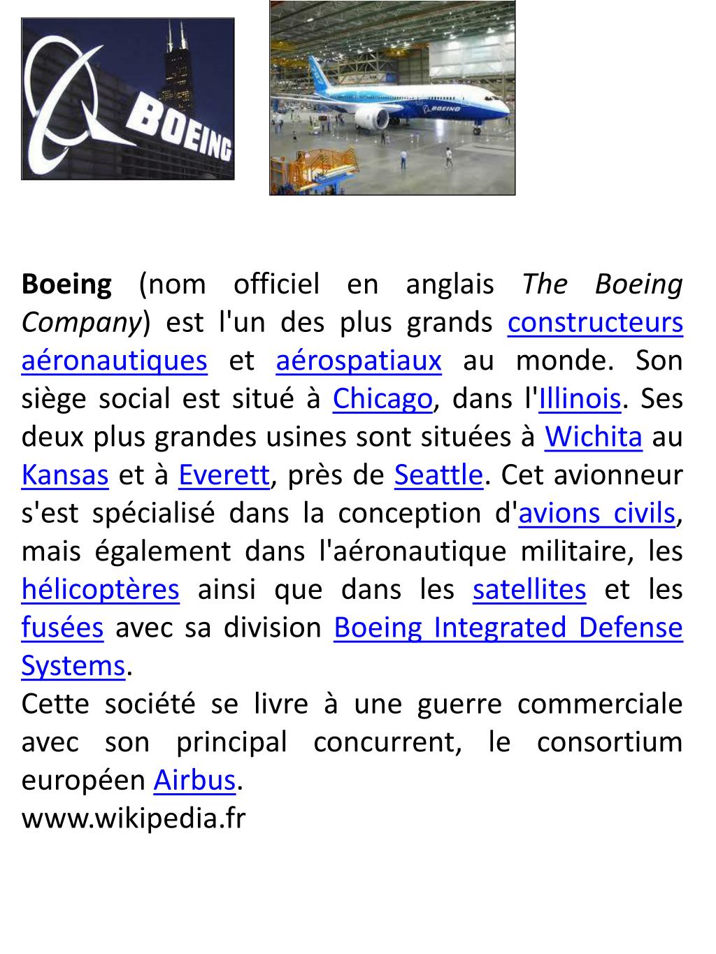 Boeing (nom officiel en anglais The Boeing Company) est l'un des plus grands constructeurs aéronautiques et aérospatiaux au monde. Son siège social est situé à Chicago, dans l'Illinois. Ses deux plus grandes usines sont situées à Wichita au Kansas et à Everett, près de Seattle. Cet avionneur s'est spécialisé dans la conception d'avions civils, mais également dans l'aéronautique militaire, les hélicoptères ainsi que dans les satellites et les fusées avec sa division Boeing IntegratedDefenseSystems. Cette société se livre à une guerre commerciale avec son principal concurrent, le consortium européen Airbus. www.wikipedia.fr