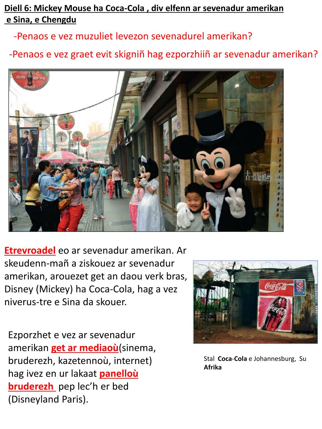 Diell 6: Mickey Mouse ha Coca-Cola , div elfenn ar sevenadur amerikan e Sina, e Chengdu • -Penaos e vezmuzulietlevezonsevenadurel amerikan? -Penaos e vezgraetevitskigniñhagezporzhiiñ ar sevenadur amerikan? Etrevroadel eo ar sevenadur amerikan. Ar skeudenn-mañ a ziskouez ar sevenadur amerikan, arouezetget an daouverk bras, Disney (Mickey) ha Coca-Cola, hag a vezniverus-tre e Sina da skouer. • Ezporzhet e vez ar sevenadur amerikan get ar mediaoù(sinema, bruderezh, kazetennoù, internet) hagivez en ur lakaatpanelloùbruderezhpep lec’h er bed(Disneyland Paris). Stal Coca-Cola e Johannesburg, Su Afrika