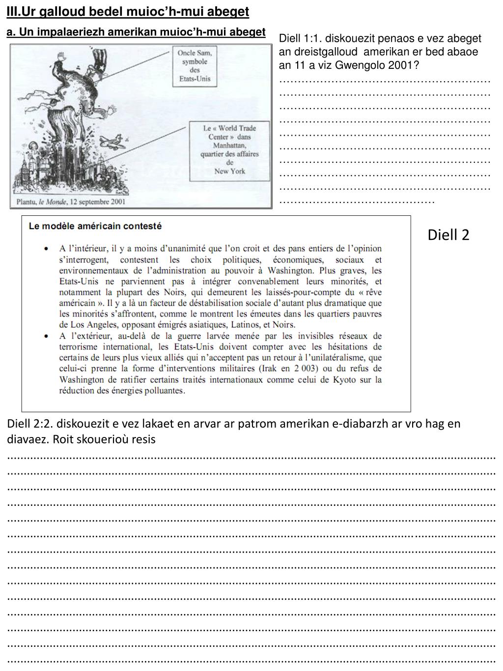 Diell 1: • An impalaeriezh amerikan a vez muioc’h-mui abeget peogwir emañ skeudennet ar patrom amerikan (Oncle Sam alegorienn ar SUA a reprezant un den gwenn bras, kozh a-walc’h get blev gwenn hir hag ur bouc’hig barv.) taget get kirri-nij. Un den ramzel eo hag e stourm enep tagadennoù ur c’harr-nij é tonet. • *Andrew Jackson 7vet Prezidant ar SUA a oa bet ar skouer). Emañ Uncle Sam* a-us da dourioù New-York e karter an aferioù , ar CBD. • Skeudenniñ a ra Uncle Sam ar galloud ekonomikel, ar gapitalouriezh( capitalisme) liberal liammet get an argant. • Distabil e teu da vout hag en arvar emañ. • Reprezantiñ a ra an gwall-taolioù Manhattan àt an Twin Towers d’an 21 a viz Gwengolo 2001. • Lakaet e vez àr-well ar galloud amerikan abeget, n’eo ket ken gendarmed ar bed, taget eo bet an arouez a reprezant ar galloud ekonomikel amerikan get an Div Tour. • Diell 2 • En diabarzh: • Minorelezhioù( ar Vorianed,ar Latinos) ar re baourañ er gevredigezh amerikan. Strollet int er ghettoioù(Harlem, Bronx). En diavaez: • -Bec’h get ar C’hendalc’h Kyoto, ur c’henemglev etre ar Stad er bed get ar pal bihanaat an efedoù ti-gwer e 1995èl an dioksid karbon, metan, diazot. Ne laka ket ar SUA e-pleustr en e vro. • -SUA enep Lez varn etrevroadel e 1998 a-benn barniñ tud o deus tamallet gouennlazhioù. • -Kemer perzh SUA er brezel Irak e 2003 a oa bet nac’het get Frañs edan J. Chirac.