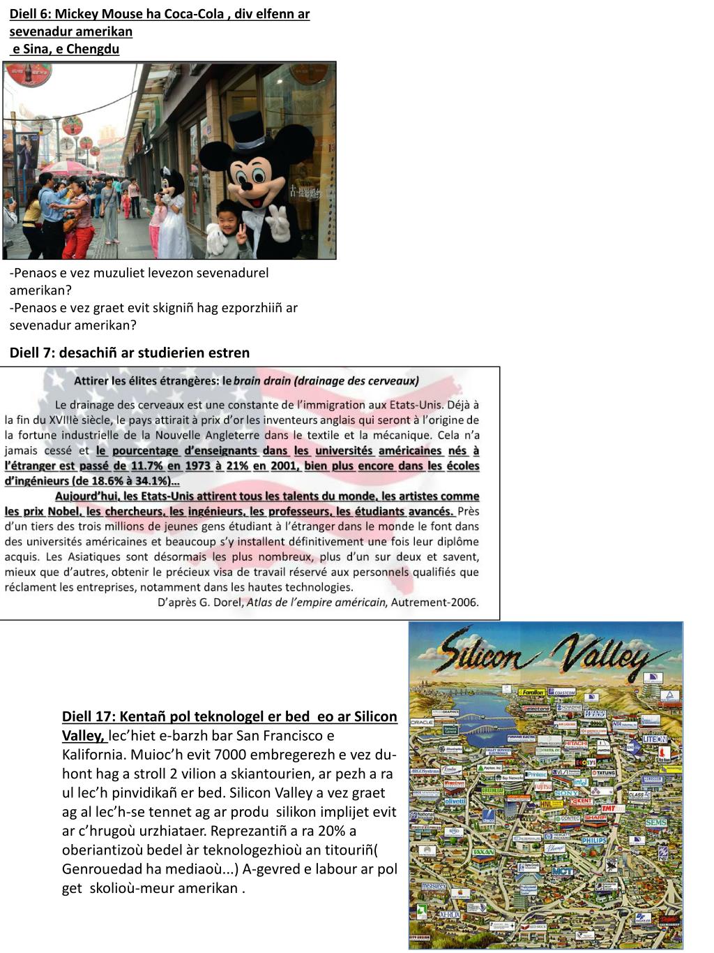 Diell 6: Mickey Mouse ha Coca-Cola , div elfenn ar sevenadur amerikan e Sina, e Chengdu -Penaos e vezmuzulietlevezonsevenadurel amerikan? -Penaos e vezgraetevitskigniñhagezporzhiiñ ar sevenadur amerikan? Diell 7: desachiñ ar studierienestren Diell 17: Kentañ pol teknologel er bed eo ar Silicon Valley, lec’hiet e-barzh bar San Francisco e Kalifornia. Muioc’h evit 7000 embregerezh e vez du-hont hag a stroll 2 vilion a skiantourien, ar pezh a ra ul lec’h pinvidikañ er bed. Silicon Valley a vez graet ag al lec’h-se tennet ag ar produ silikon implijet evit ar c’hrugoù urzhiataer. Reprezantiñ a ra 20% a oberiantizoù bedel àr teknologezhioù an titouriñ( Genrouedad ha mediaoù...) A-gevred e labour ar pol get skolioù-meur amerikan .