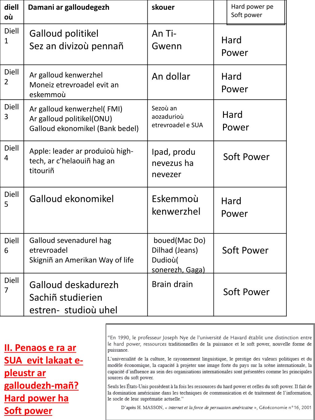 Galloud politikel Sez an divizoù pennañ An Ti-Gwenn Hard Power Ar galloud kenwerzhel Moneiz etrevroadel evit an eskemmoù An dollar Hard Power Ar galloud kenwerzhel( FMI) Ar galloud politikel(ONU) Galloud ekonomikel (Bank bedel) Sezoù an aozadurioù etrevroadel e SUA Hard Power Apple: leader ar produioù high-tech, ar c’helaouiñ hag an titouriñ Ipad, produ nevezus ha nevezer Soft Power Galloud ekonomikel Eskemmoù kenwerzhel Hard Power Galloud sevenadurel hag etrevroadel Skigniñ an Amerikan Way of life boued(Mac Do) Dilhad (Jeans) Dudioù( sonerezh, Gaga) Soft Power Galloud deskadurezh Sachiñ studierien estren- studioù uhel Brain drain Soft Power II. Penaos e ra ar SUA evitlakaat e-pleustr ar galloudezh-mañ? Hard power ha Soft power