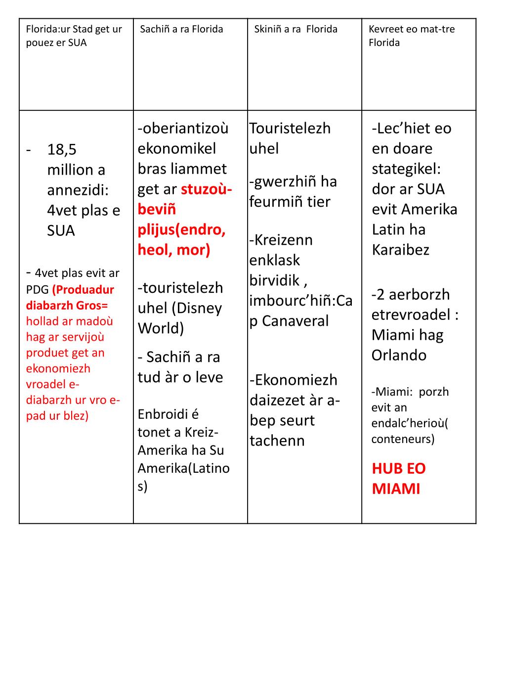 -oberiantizoù ekonomikel bras liammet get ar stuzoù-beviñ plijus(endro, heol, mor) Touristelezh uhel -Lec’hiet eo en doare stategikel: dor ar SUA evit Amerika Latin ha Karaibez • 18,5 million a annezidi: 4vet plas e SUA -gwerzhiñ ha feurmiñ tier -Kreizenn enklask birvidik , imbourc’hiñ:Cap Canaveral - 4vet plas evit ar PDG (Produadur diabarzh Gros= hollad ar madoù hag ar servijoù produet get an ekonomiezh vroadel e-diabarzh ur vro e-pad ur blez) -touristelezh uhel (Disney World) -2 aerborzh etrevroadel : Miami hag Orlando - Sachiñ a ra tud àr o leve -Ekonomiezh daizezet àr a-bep seurt tachenn -Miami: porzh evit an endalc’herioù( conteneurs) Enbroidi é tonet a Kreiz-Amerika ha Su Amerika(Latinos) HUB EO MIAMI