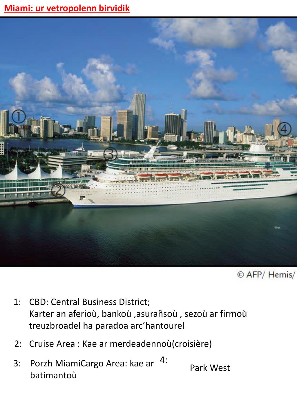 Miami: ur vetropolennbirvidik • 1: CBD: Central Business District; Karter an aferioù, bankoù ,asurañsoù , sezoù ar firmoù treuzbroadel ha paradoa arc’hantourel • 2: Cruise Area : Kae ar merdeadennoù(croisière) 4: • 3: Porzh MiamiCargo Area: kae ar batimantoù Park West