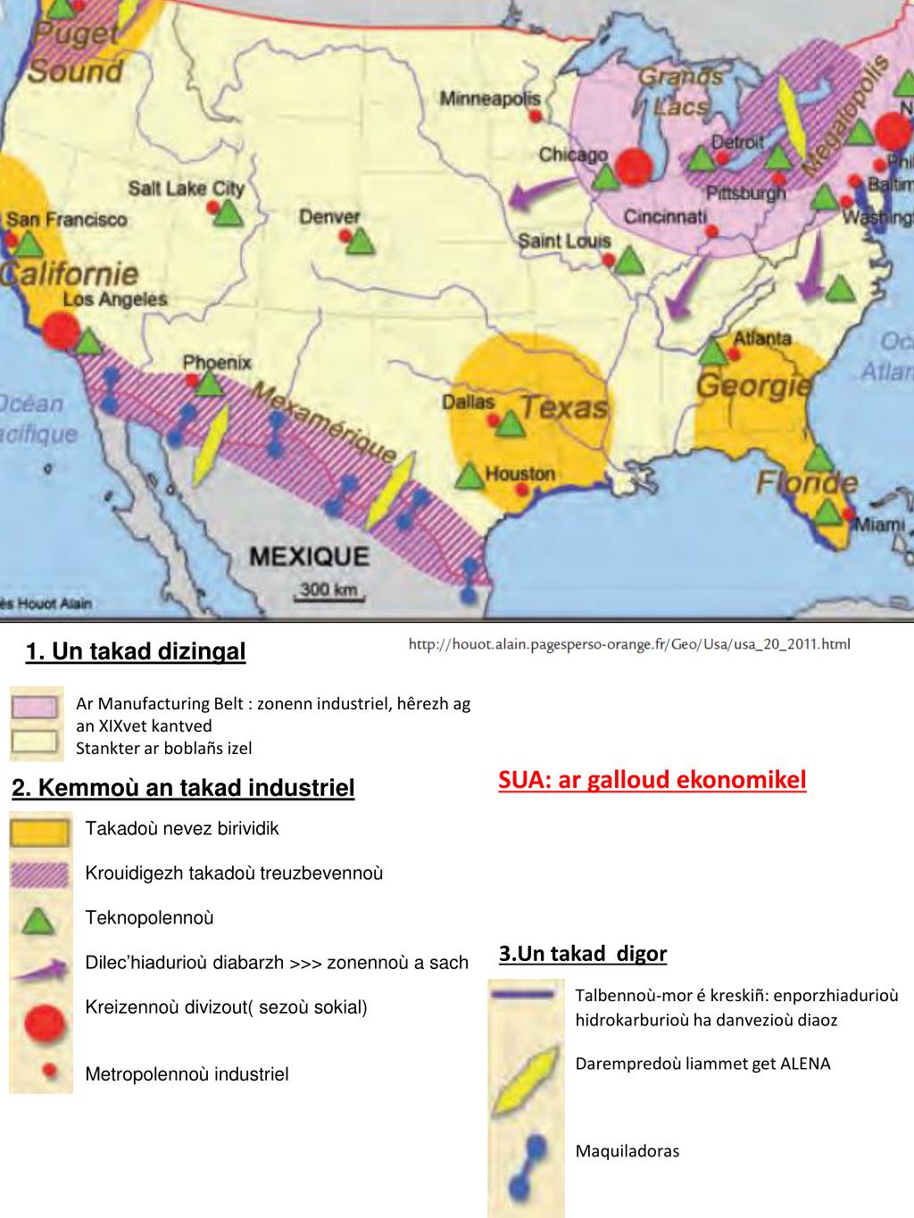 1. Un takaddizingal Ar ManufacturingBelt : zonenn industriel, hêrezh ag an XIXvetkantved Stankter ar boblañsizel SUA: ar galloudekonomikel 2. Kemmoù an takad industriel Takadoùnevezbirividik Krouidigezhtakadoùtreuzbevennoù Teknopolennoù Dilec’hiadurioùdiabarzh >>> zonennoùa sach Kreizennoùdivizout( sezoùsokial) Metropolennoù industriel 3.Un takaddigor Talbennoù-mor é kreskiñ: enporzhiadurioùhidrokarburioù ha danvezioùdiaoz Darempredoùliammetget ALENA Maquiladoras
