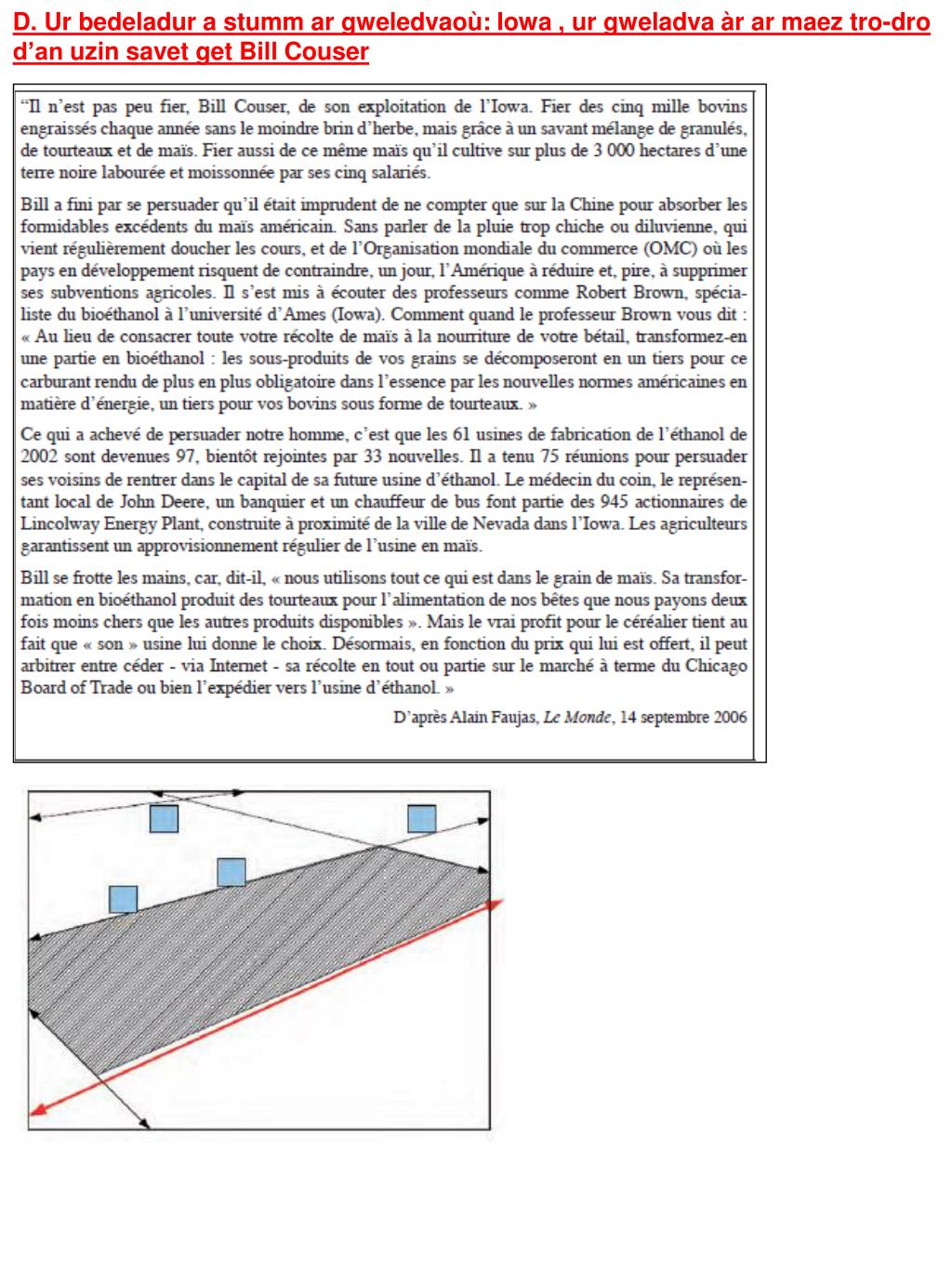 Gorread stal ti-feurm: 3000 hect get 5 implijad Ar c’helenner Brown, ag ar skol-veur iowa, arbennikaet àr ar bioethanol Produiñ a ra mais ha kig ejoned An hin get glav pe ket a c’hell lakaat en arvar produadur ar mais Un ti-bank hag embregerezh dafarioù labour-douar mekanik John Deere Sevel loened askoridik , e-maez douar Re staget doc’h ar marc’has Sina e vo é vihanaat er blezadoù é tonet Labourerien-douar arall a gas produioù. Bill Couser a studi ar boursen Chicago Board of Trade evit prizioù ar mais àr ar marc’had bedel Evit ar marc’had broadel evit ar c’hig hag etrevroadel evit ar mais Gwask an OMC a c’houlenn diget ar Stad amerikan diskenn ar yalc’hadoù roet d’ar labourerien-douar amerikan a-benn gwarn prizioù dereat evit gwerzhiñ o froduioù Ul lodenn ag ar restachoù mais a servijo da vagiñ ar loened, get ur priz div wech izeloc’h.
