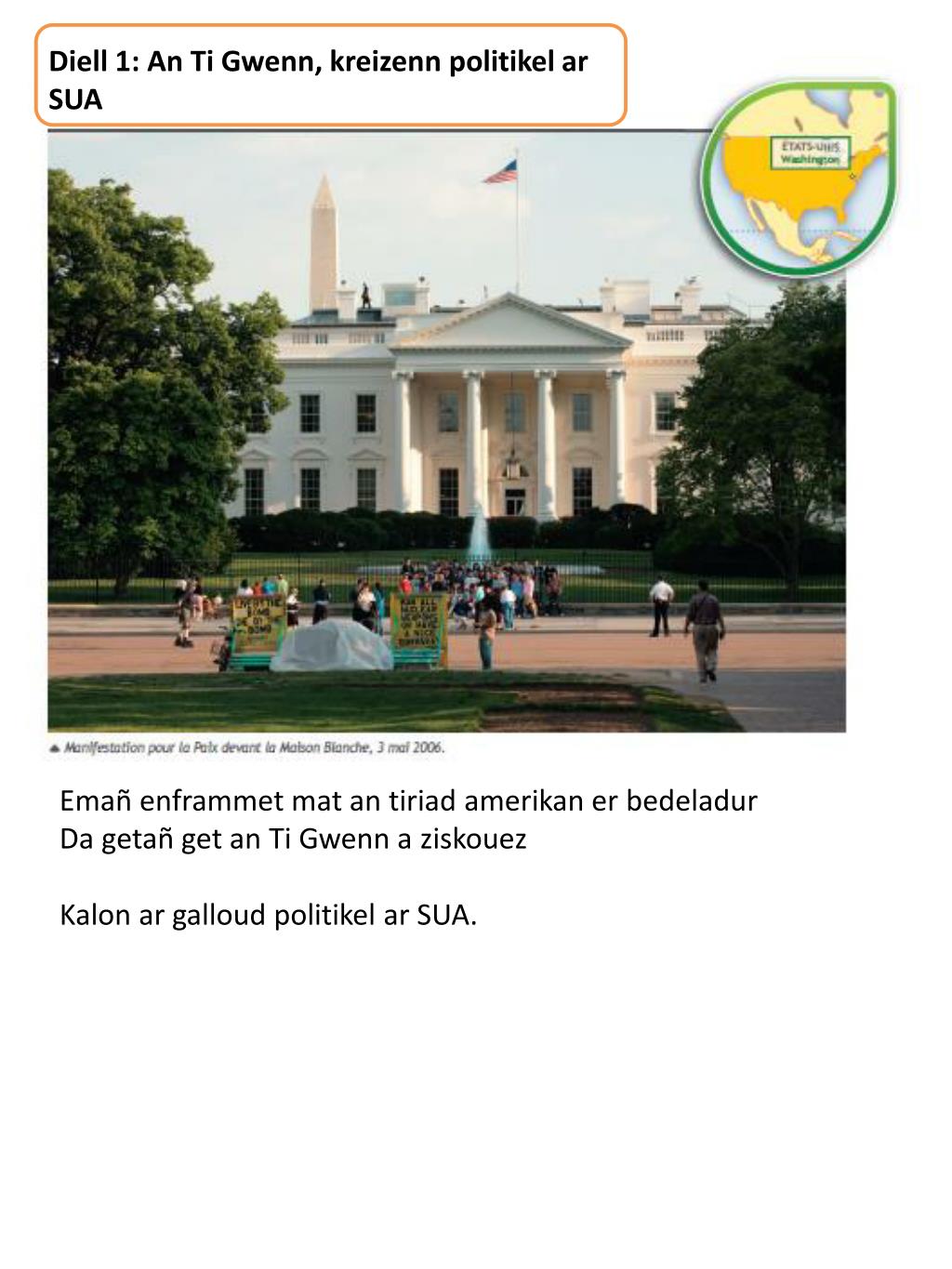 Diell 1: An Ti Gwenn, kreizennpolitikel ar SUA Emañenframmet mat an tiriad amerikan er bedeladur Da getañget an Ti Gwenn a ziskouez Kalon ar galloudpolitikel ar SUA.