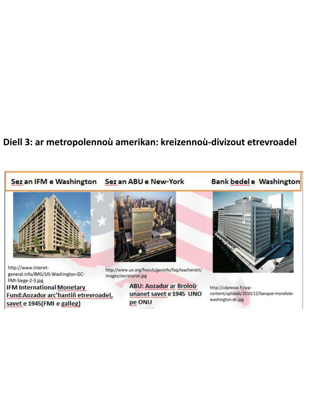 Diell 2: an dollar: benveg ar galloud Moneizetrevroadelevit an eskemmoùkenwerzh Moneizmiretget ar Stadoù (68% evit an dollar, 13% evit an euro, 4% evit ar livre sterling) Levezon amerikan àr an darempredoù: danvezioù-diaozèl an eoul-maen e vezskridennet e dollar Diell 3: ar metropolennoù amerikan: kreizennoù-divizoutetrevroadel