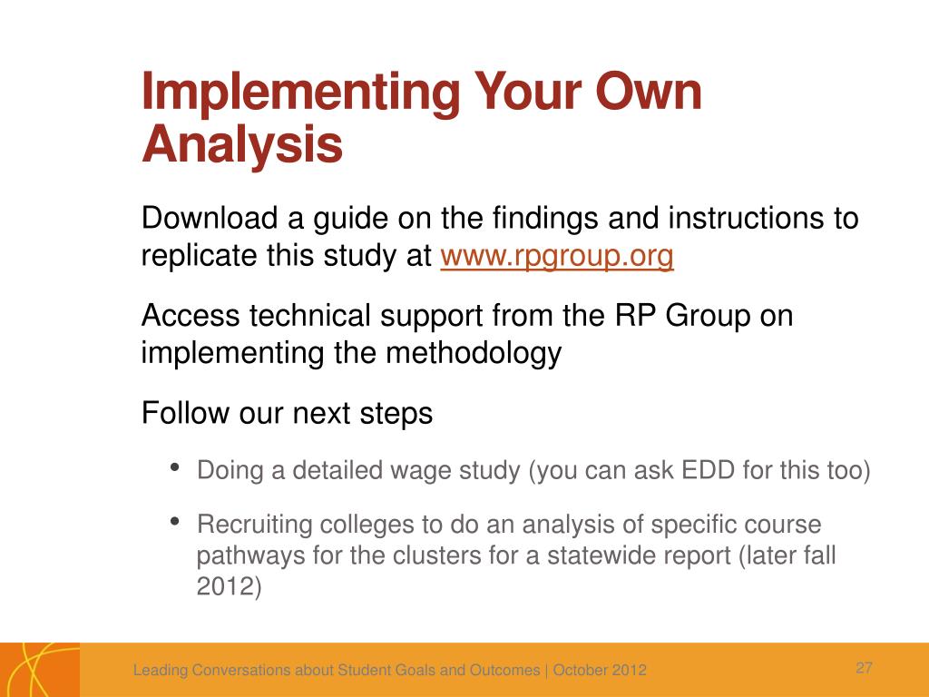 Implementing Your Own Analysis Download a guide on the findings and instructions to replicate this study at www.rpgroup.org Access technical support from the RP Group on implementing the methodology Follow our next steps • Doing a detailed wage study (you can ask EDD for this too) • Recruiting colleges to do an analysis of specific course pathways for the clusters for a statewide report (later fall 2012) Leading Conversations about Student Goals and Outcomes | October 2012