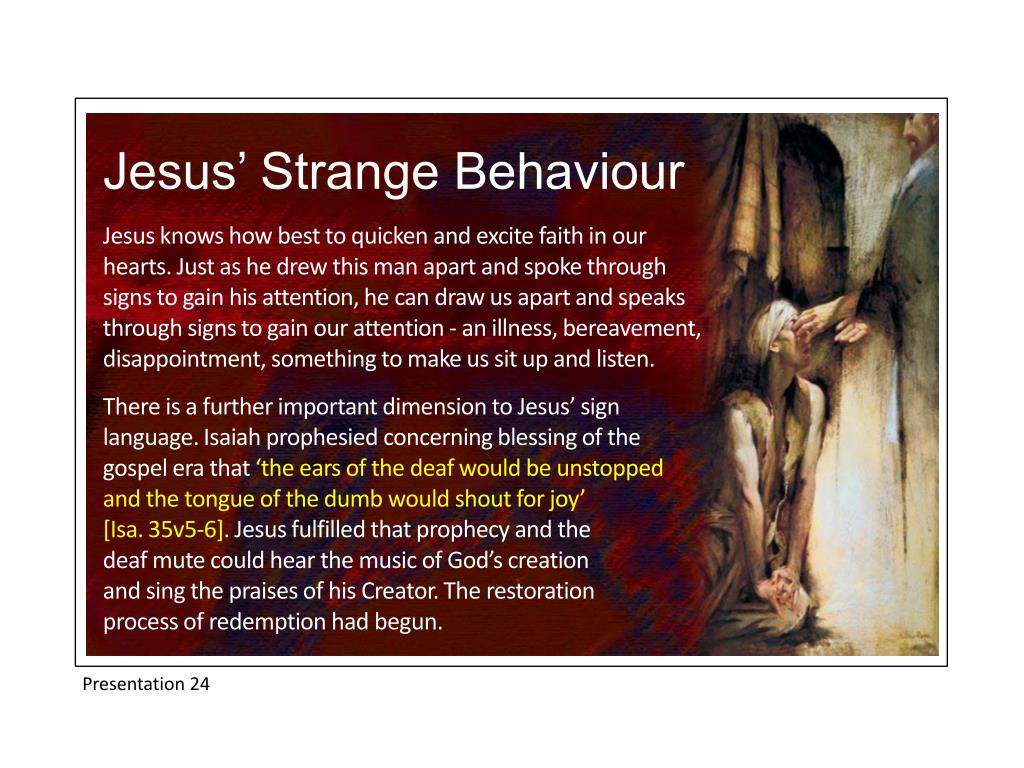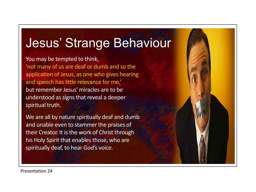 Jesus’ Strange Behaviour You may be tempted to think, ‘not many of us are deaf or dumb and so the application of Jesus, as one who gives hearing and speech has little relevance for me,’ but remember Jesus’ miracles are to be understood as signs that reveal a deeper spiritual truth. We are all by nature spiritually deaf and dumb and unable even to stammer the praises of their Creator. It is the work of Christ through his Holy Spirit that enables those, who are spiritually deaf, to hear God’s voice. Presentation 24