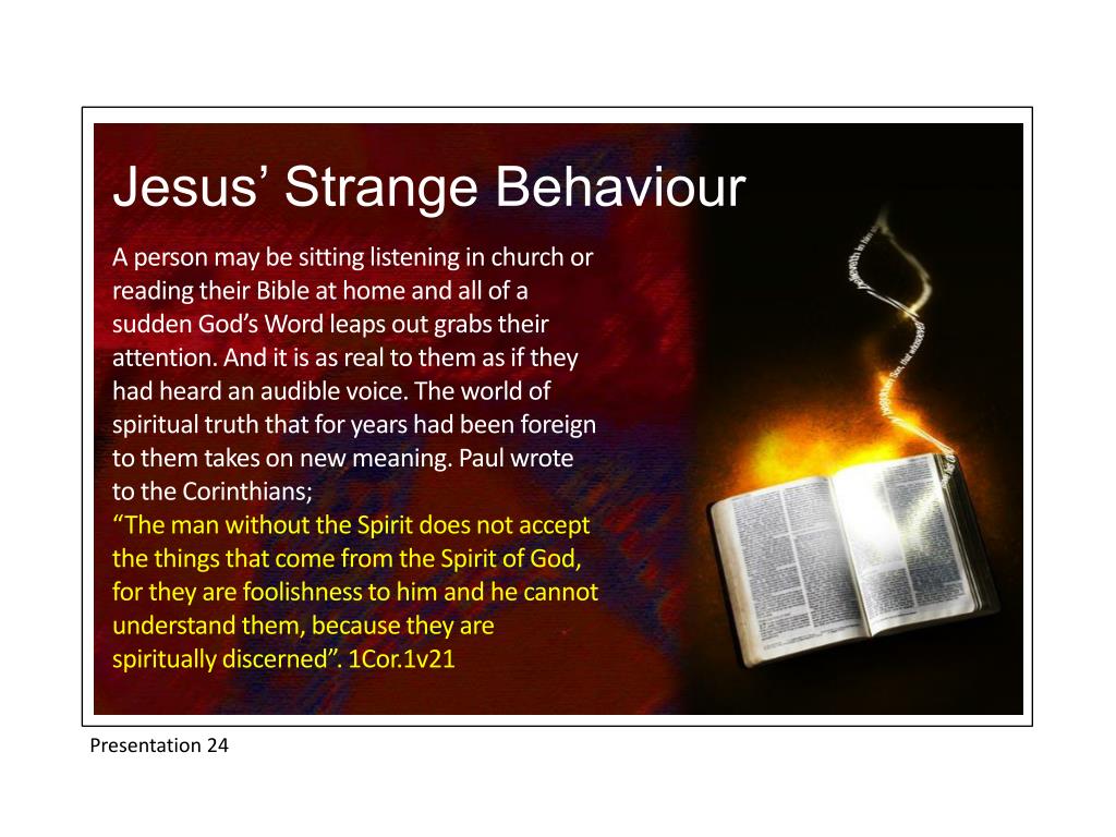 Jesus’ Strange Behaviour A person may be sitting listening in church or reading their Bible at home and all of a sudden God’s Word leaps out grabs their attention. And it is as real to them as if they had heard an audible voice. The world of spiritual truth that for years had been foreign to them takes on new meaning. Paul wrote to the Corinthians; “The man without the Spirit does not accept the things that come from the Spirit of God, for they are foolishness to him and he cannot understand them, because they are spiritually discerned”. 1Cor.1v21 Presentation 24