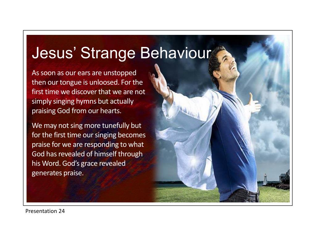Jesus’ Strange Behaviour As soon as our ears are unstopped then our tongue is unloosed. For the first time we discover that we are not simply singing hymns but actually praising God from our hearts. We may not sing more tunefully but for the first time our singing becomes praise for we are responding to what God has revealed of himself through his Word. God’s grace revealed generates praise. Presentation 24