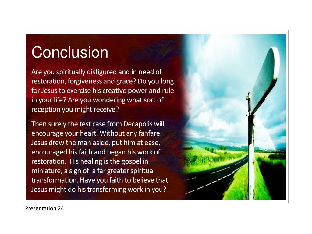 Conclusion Are you spiritually disfigured and in need of restoration, forgiveness and grace? Do you long for Jesus to exercise his creative power and rule in your life? Are you wondering what sort of reception you might receive? Then surely the test case from Decapolis will encourage your heart. Without any fanfare Jesus drew the man aside, put him at ease, encouraged his faith and began his work of restoration. His healing is the gospel in miniature, a sign of a far greater spiritual transformation. Have you faith to believe that Jesus might do his transforming work in you? Presentation 24