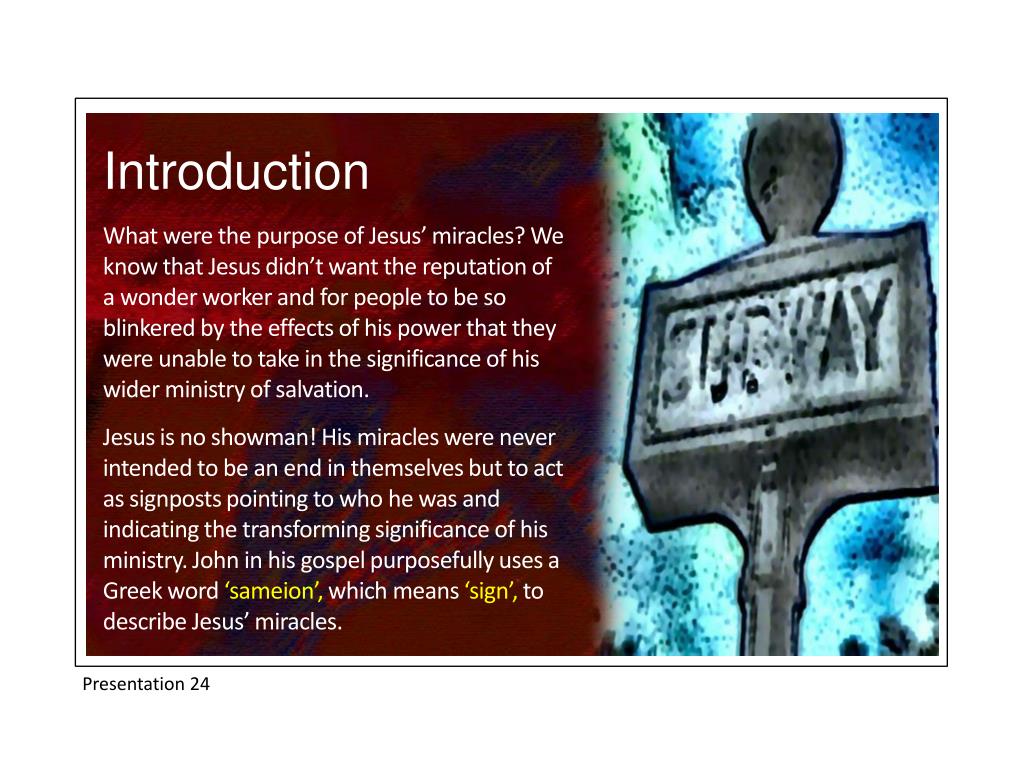 Introduction What were the purpose of Jesus’ miracles? We know that Jesus didn’t want the reputation of a wonder worker and for people to be so blinkered by the effects of his power that they were unable to take in the significance of his wider ministry of salvation. Jesus is no showman! His miracles were never intended to be an end in themselves but to act as signposts pointing to who he was and indicating the transforming significance of his ministry. John in his gospel purposefully uses a Greek word ‘sameion’, which means ‘sign’, to describe Jesus’ miracles. Presentation 24