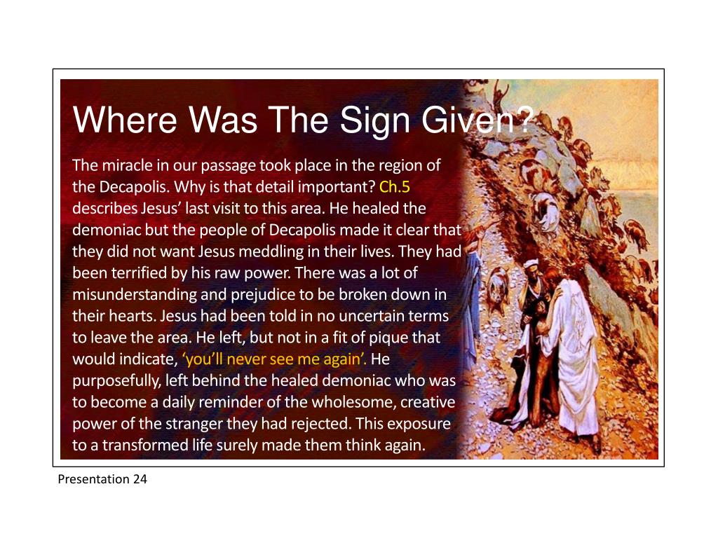 Where Was The Sign Given? The miracle in our passage took place in the region of the Decapolis. Why is that detail important? Ch.5 describes Jesus’ last visit to this area. He healed the demoniac but the people of Decapolis made it clear that they did not want Jesus meddling in their lives. They had been terrified by his raw power. There was a lot of misunderstanding and prejudice to be broken down in their hearts. Jesus had been told in no uncertain terms to leave the area. He left, but not in a fit of pique that would indicate, ‘you’ll never see me again’. He purposefully, left behind the healed demoniac who was to become a daily reminder of the wholesome, creative power of the stranger they had rejected. This exposure to a transformed life surely made them think again. Presentation 24