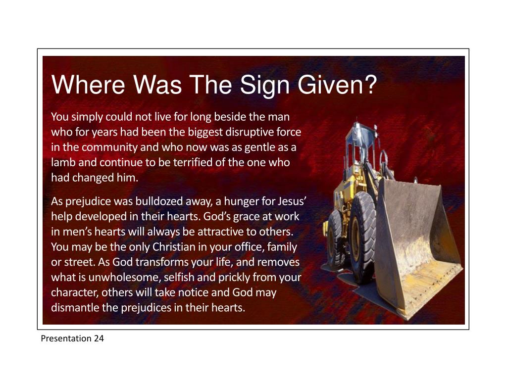 Where Was The Sign Given? You simply could not live for long beside the man who for years had been the biggest disruptive force in the community and who now was as gentle as a lamb and continue to be terrified of the one who had changed him. As prejudice was bulldozed away, a hunger for Jesus’ help developed in their hearts. God’s grace at work in men’s hearts will always be attractive to others. You may be the only Christian in your office, family or street. As God transforms your life, and removes what is unwholesome, selfish and prickly from your character, others will take notice and God may dismantle the prejudices in their hearts. Presentation 24