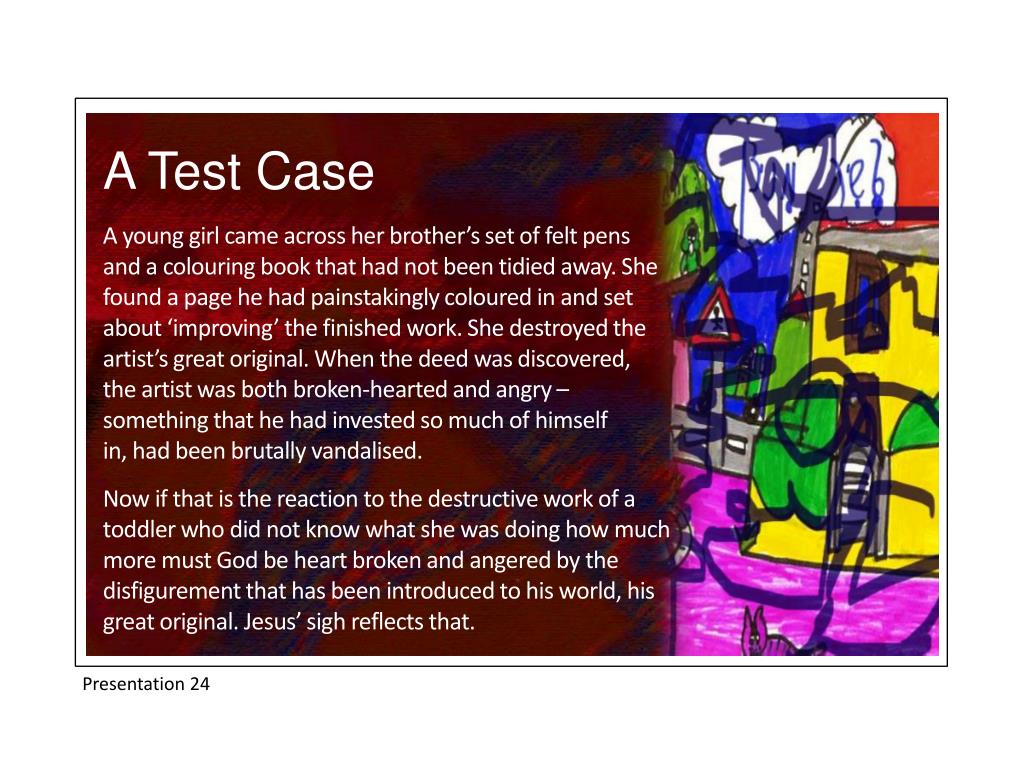 A Test Case A young girl came across her brother’s set of felt pens and a colouring book that had not been tidied away. She found a page he had painstakingly coloured in and set about ‘improving’ the finished work. She destroyed the artist’s great original. When the deed was discovered, the artist was both broken-hearted and angry – something that he had invested so much of himself in, had been brutally vandalised. Now if that is the reaction to the destructive work of a toddler who did not know what she was doing how much more must God be heart broken and angered by the disfigurement that has been introduced to his world, his great original. Jesus’ sigh reflects that. Presentation 24