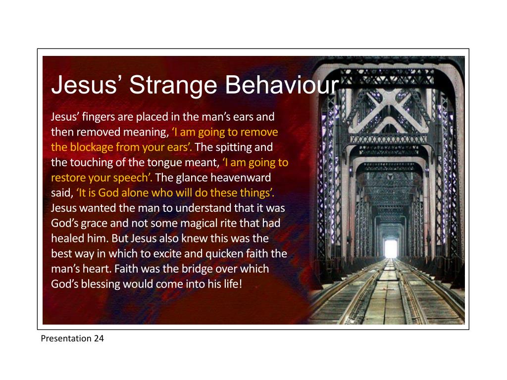 Jesus’ Strange Behaviour Jesus’ fingers are placed in the man’s ears and then removed meaning, ‘I am going to remove the blockage from your ears’. The spitting and the touching of the tongue meant, ‘I am going to restore your speech’. The glance heavenward said, ‘It is God alone who will do these things’. Jesus wanted the man to understand that it was God’s grace and not some magical rite that had healed him. But Jesus also knew this was the best way in which to excite and quicken faith the man’s heart. Faith was the bridge over which God’s blessing would come into his life! Presentation 24