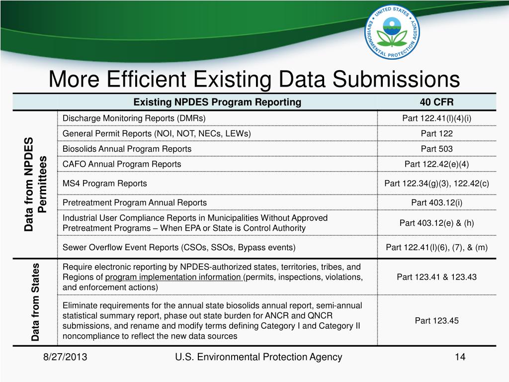 Reporting Burden On States And Regulated Entities Is Reduced • Obtain required information directly from the source where data is generated: from permittees in most cases; from the states/EPA where they are the unique source of program implementation data such as permits, inspections, violation determinations, and enforcement actions. • Reduce burden of existing paper-based reporting from regulated facilities by requiring electronic data submissions; results in overall cost savings for those regulated. • Significant reduction in reporting burden for states due to DMR reporting from facilities; also results in significant cost savings for states. • Propose to eliminate specific existing state reporting requirements: • Annual Noncompliance Report (for non-majors) (40 CFR 123.45) • Quarterly Noncompliance Report (for majors) (40 CFR 123.45) • Semi-Annual Statistical Summary Report (for majors) (40 CFR 123.45) U.S. Environmental Protection Agency