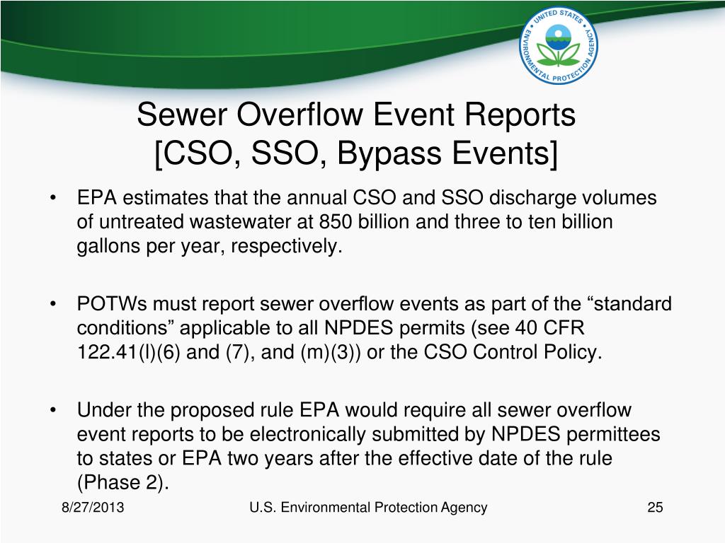 Sewer Overflow Event Reports[CSO, SSO, Bypass Events] • EPA estimates that the annual CSO and SSO discharge volumes of untreated wastewater at 850 billion and three to ten billion gallons per year, respectively. • POTWs must report sewer overflow events as part of the “standard conditions” applicable to all NPDES permits (see 40 CFR 122.41(l)(6) and (7), and (m)(3)) or the CSO Control Policy. • Under the proposed rule EPA would require all sewer overflow event reports to be electronically submitted by NPDES permittees to states or EPA two years after the effective date of the rule (Phase 2). U.S. Environmental Protection Agency