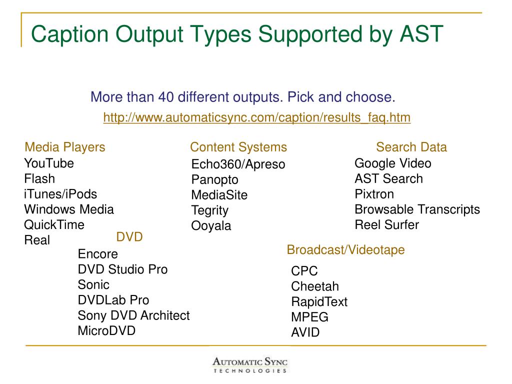 DVD Encore DVD Studio Pro Sonic DVDLab Pro Sony DVD Architect MicroDVD Media Players Search Data YouTube Flash iTunes/iPods Windows Media QuickTime Real Google Video AST Search Pixtron Browsable Transcripts Reel Surfer Broadcast/Videotape Content Systems CPC Cheetah RapidText MPEG AVID Echo360/Apreso Panopto MediaSite Tegrity Ooyala Caption Output Types Supported by AST More than 40 different outputs. Pick and choose. http://www.automaticsync.com/caption/results_faq.htm