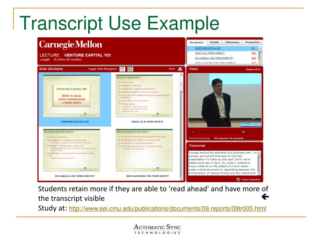 Transcript Use Example Students retain more if they are able to 'read ahead' and have more of the transcript visible Study at: http://www.sei.cmu.edu/publications/documents/09.reports/09tr005.html