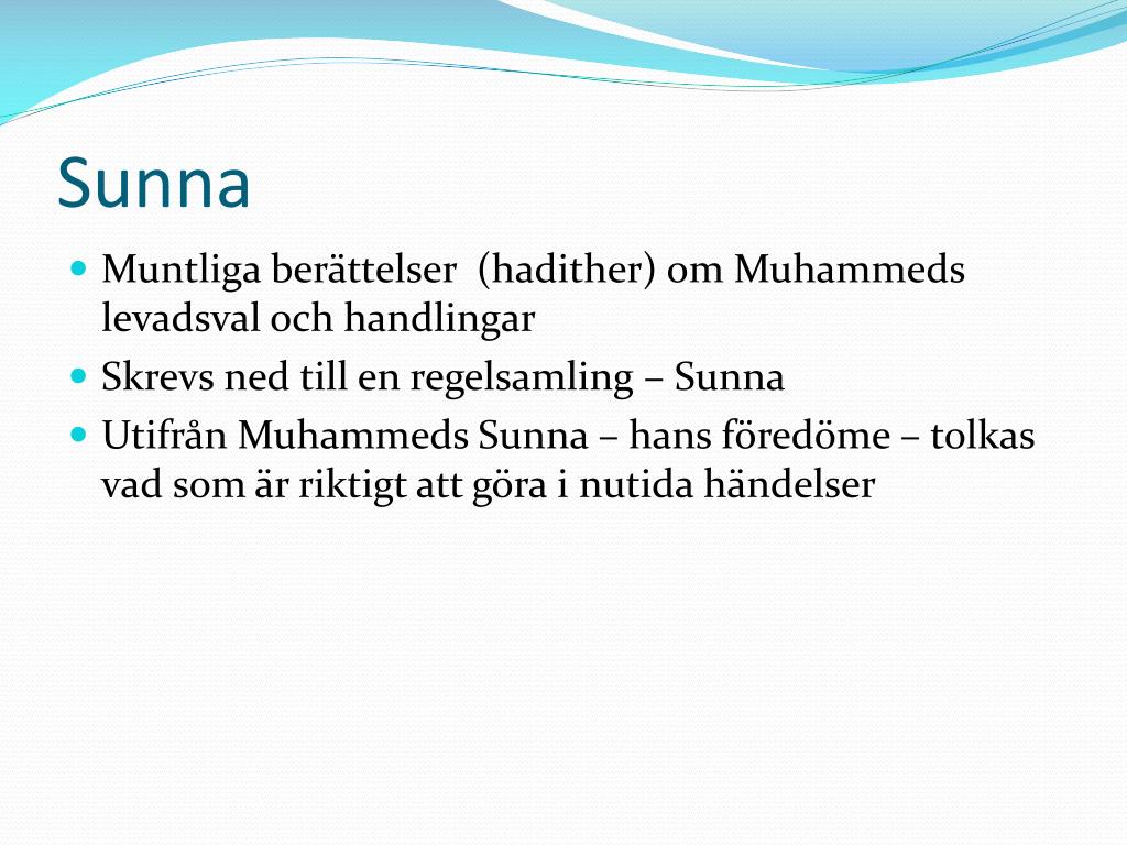 Sunna • Muntliga berättelser (hadither) om Muhammeds levadsval och handlingar • Skrevs ned till en regelsamling – Sunna • Utifrån Muhammeds Sunna – hans föredöme – tolkas vad som är riktigt att göra i nutida händelser